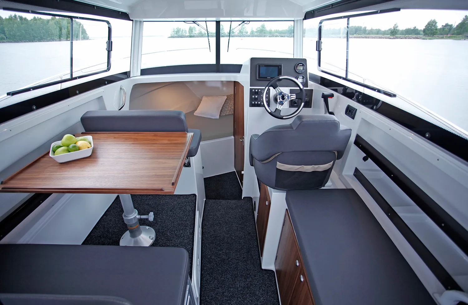 Hiljainen ja vakaa Husky R7 –alumiinivene sopii mainiosti vaikkapa saaristoon suuntautuville tutkimusmatkoille. Monipuolisessa Husky R7 -alumiiniveneessä kaikki matkustajat istuvat suojassa korkean tuulilasin takana. Moottoriveneen alumiininen runko kestää kovemmankin kelin ja kehnommalla säällä avuksi tulee näppärästi esiin saatava suojakuomu. Husky R7:n avoimella keulakannella on siistit säilytystilat lepuuttajille, mukavat istuimet ja reilunkokoinen U:n muotoinen sohva, joka muuntuu aurinkokanneksi käden käänteessä. Tämä moottorivene on täydellinen perhevene koko päivän mittaisille vesireissuille.