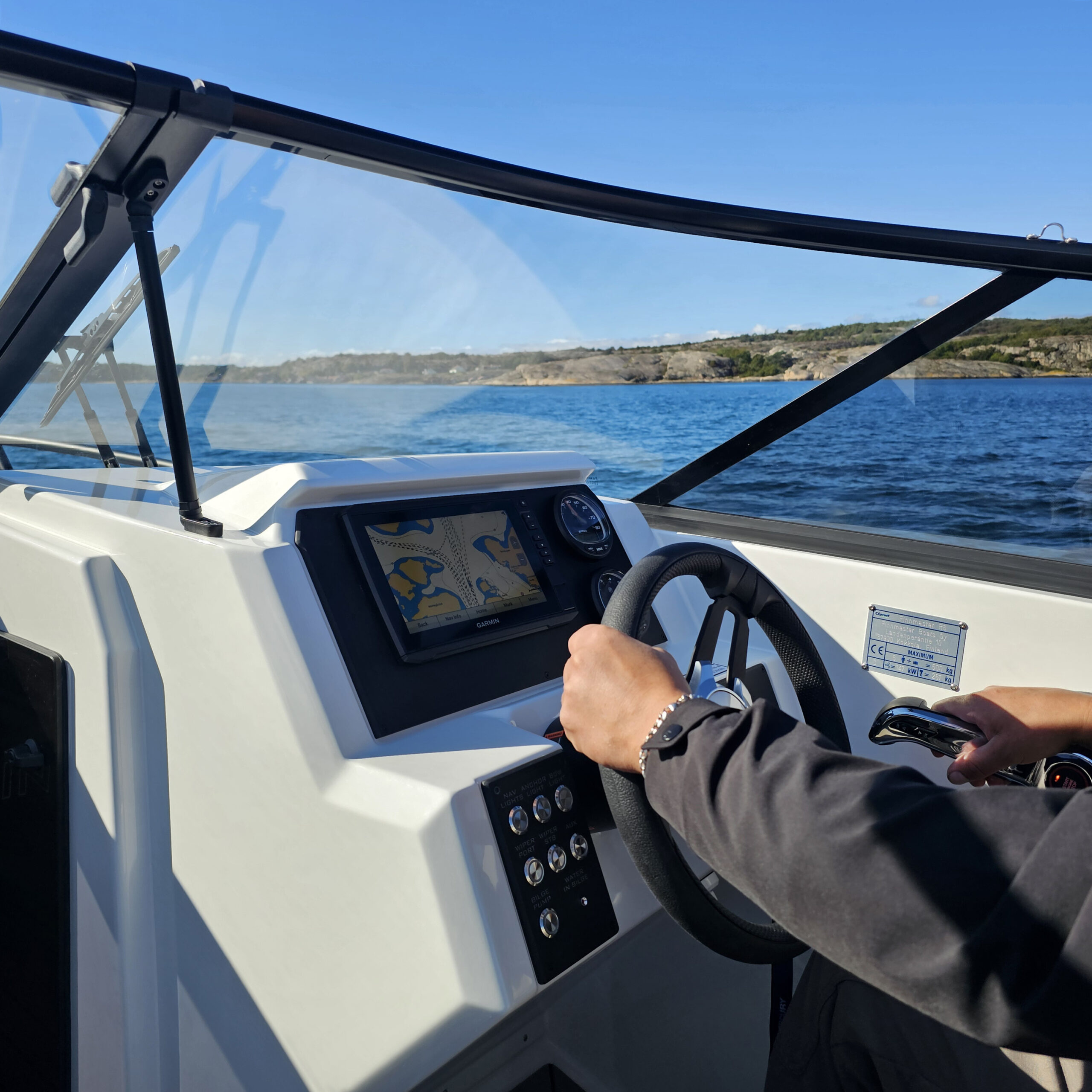 Whether you’re looking for a SUV boat, fishing boat or weekend boat where the whole family can stay overnight – this is just the right motorboat for you. The boat’s redesigned extended roof provides protection from rain and sunshine for those staying in the aft deck. The spacious wheelhouse has a large full-width sunroof and a four-person dinette, and a sizeable galley for travel comfort. At the forward cabin, you will find plenty of storage space as well as a large, separate toilet and sleeping berths for four adults.
