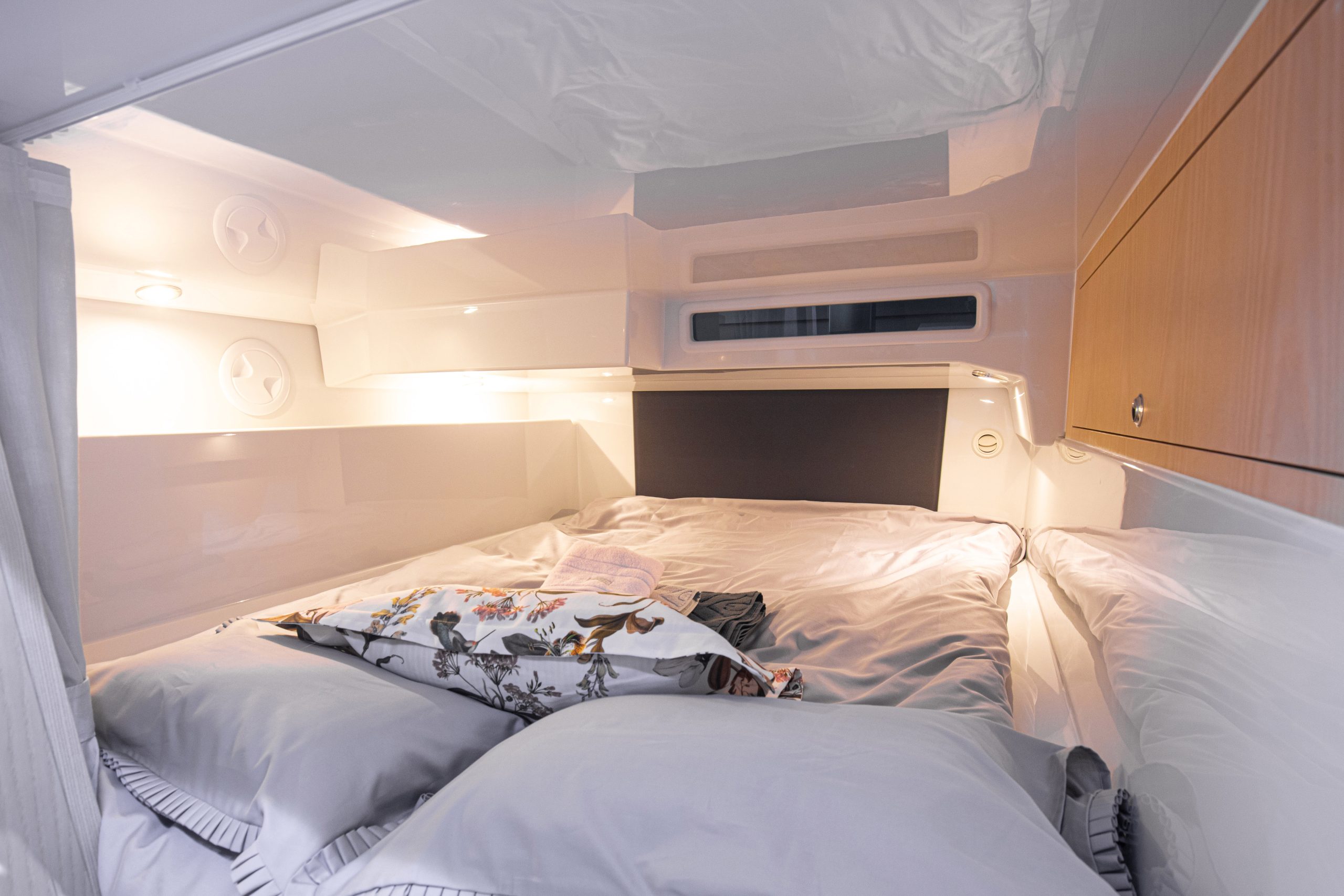 The T9 ST is a large and stable day cruiser with a spacious cabin and an electrically opening and closing large roof. The large panoramic windows are made without vertical bars, offering an unobstructed view out of the boat, and the large windows provides protection and comfort in all weather conditions. The Finnmaster T9’s renowned sleek, sporty design brings a touch of luxury to leisure, and is further enhanced by the ST model’s many solutions. For instance, the rear canopy slides smoothly into the wide roof beams and is easy to install.